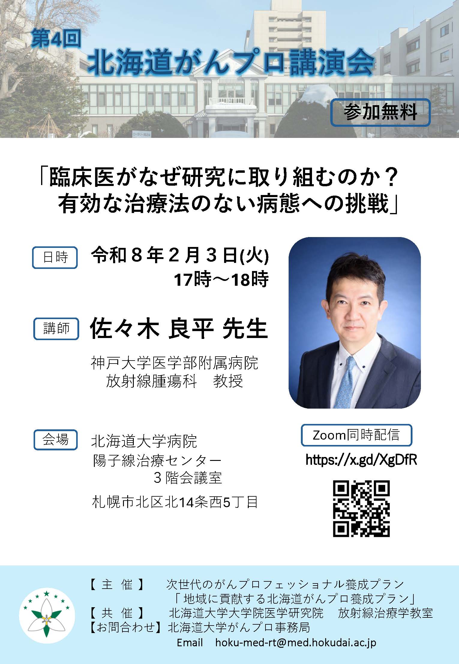 ニュース 令和8年2月3日(火) 第4回北海道がんプロ特別講演会を開催いたします(講師:佐々木良平先生) 2025.11.25 PICK UP 令和8年2月3日(火)神戸大学医学部附属病院放射線腫瘍科教授 佐々木良平先生をお迎えして、第回北海道がんプロ講演会を開催いたします。多くの皆様のご参加をお待ち申し上げております。